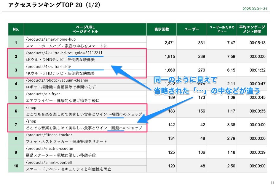 そのため、同じ「ページパスとスクリーンクラス」で異なる「ページタイトルとスクリーン名」が計測されている場合は複数行で出力されます。
